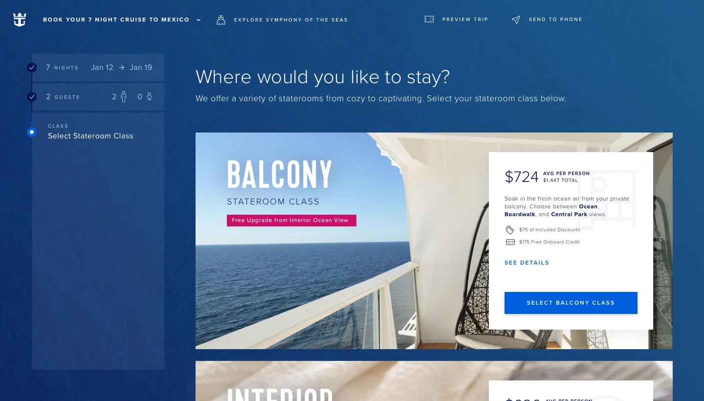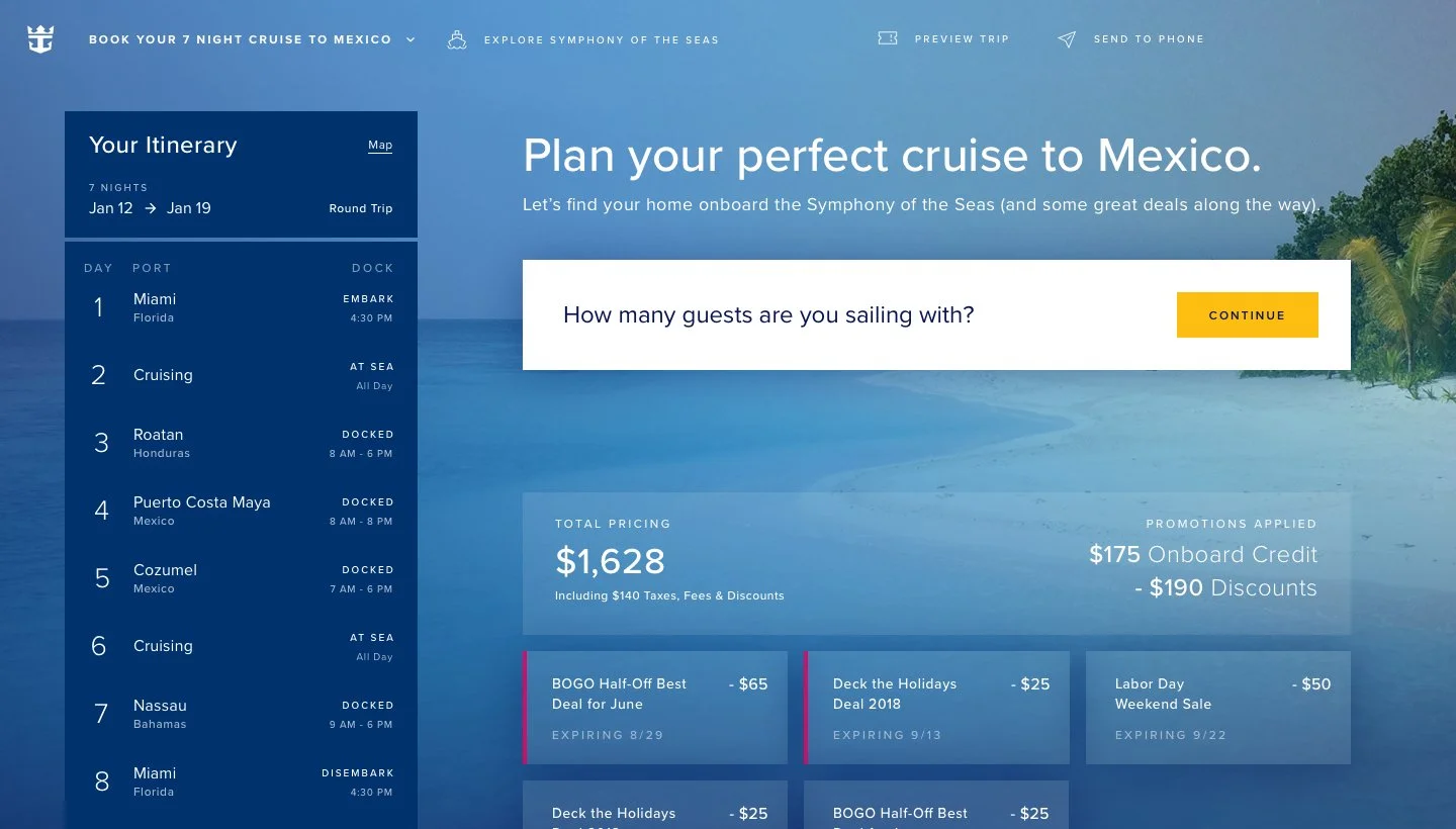 In 2018, Royal Caribbean's website advertised nothing less than the best time you'd ever have on a cruise. The design language focused around adventure-packed imagery, vibrant colors that matched their tropical destinations, and bold type exclaiming the great deals available to make it all yours. That excitement stopped cold in its tracks as soon as you entered the booking funnel.